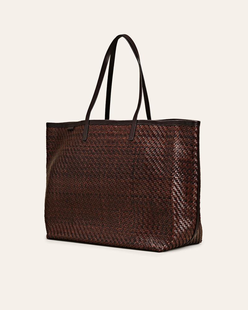 Isai XL is handwoven in high quality leather and crafted in tartan pattern. Each bag is produced by artisans in India, known for its rich and diverse weaving tradition.