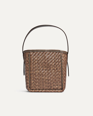 Brown woven bucket bag on a white background