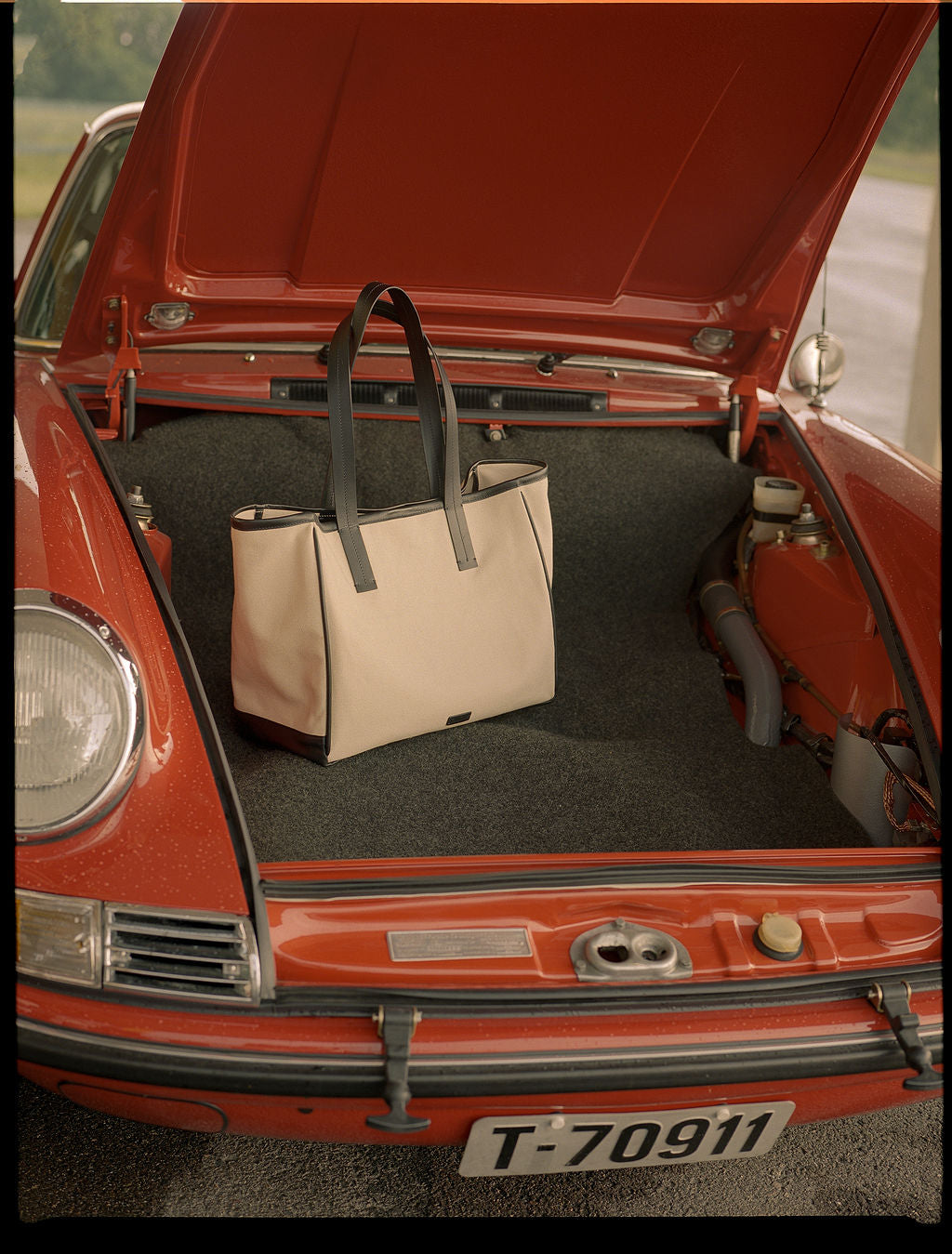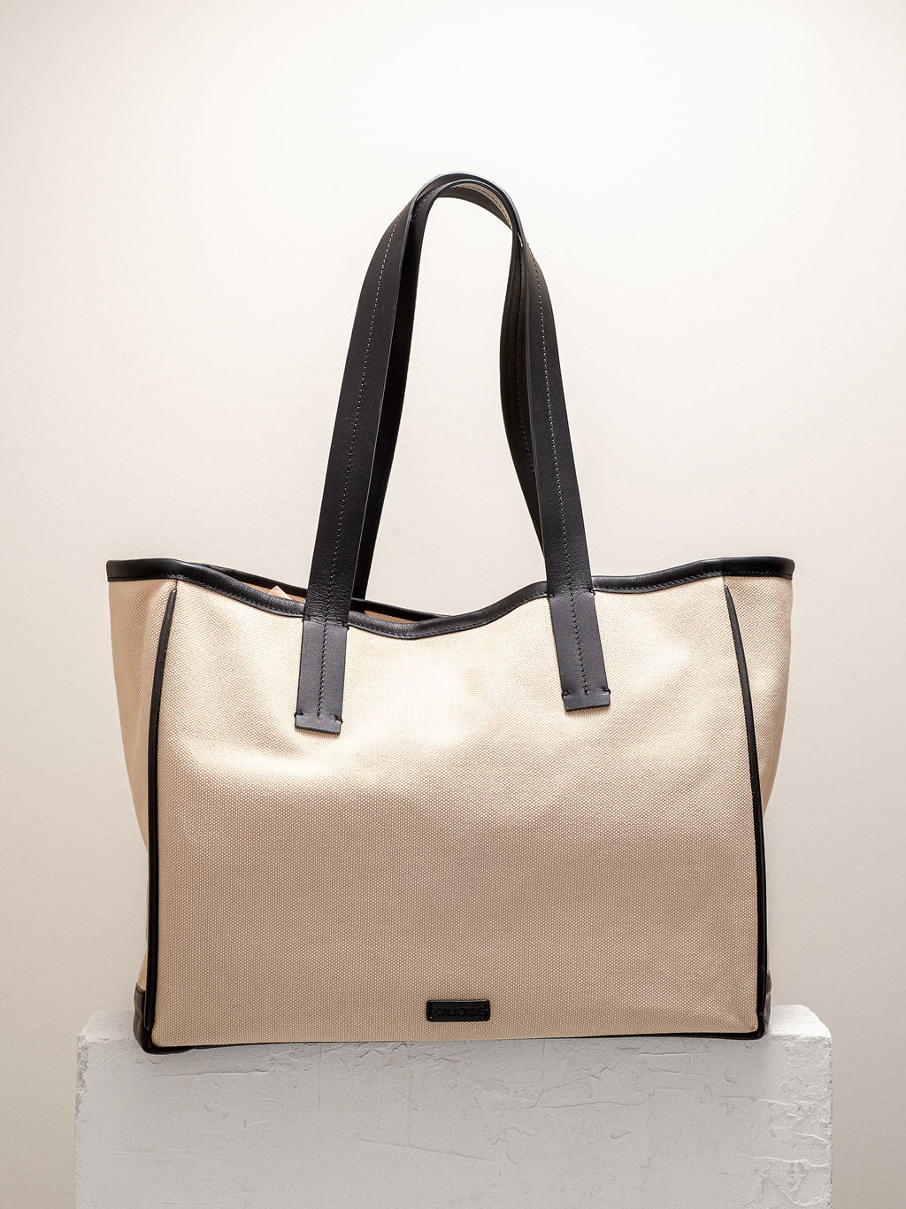 Roomy canvas tote with leather handles and details.
