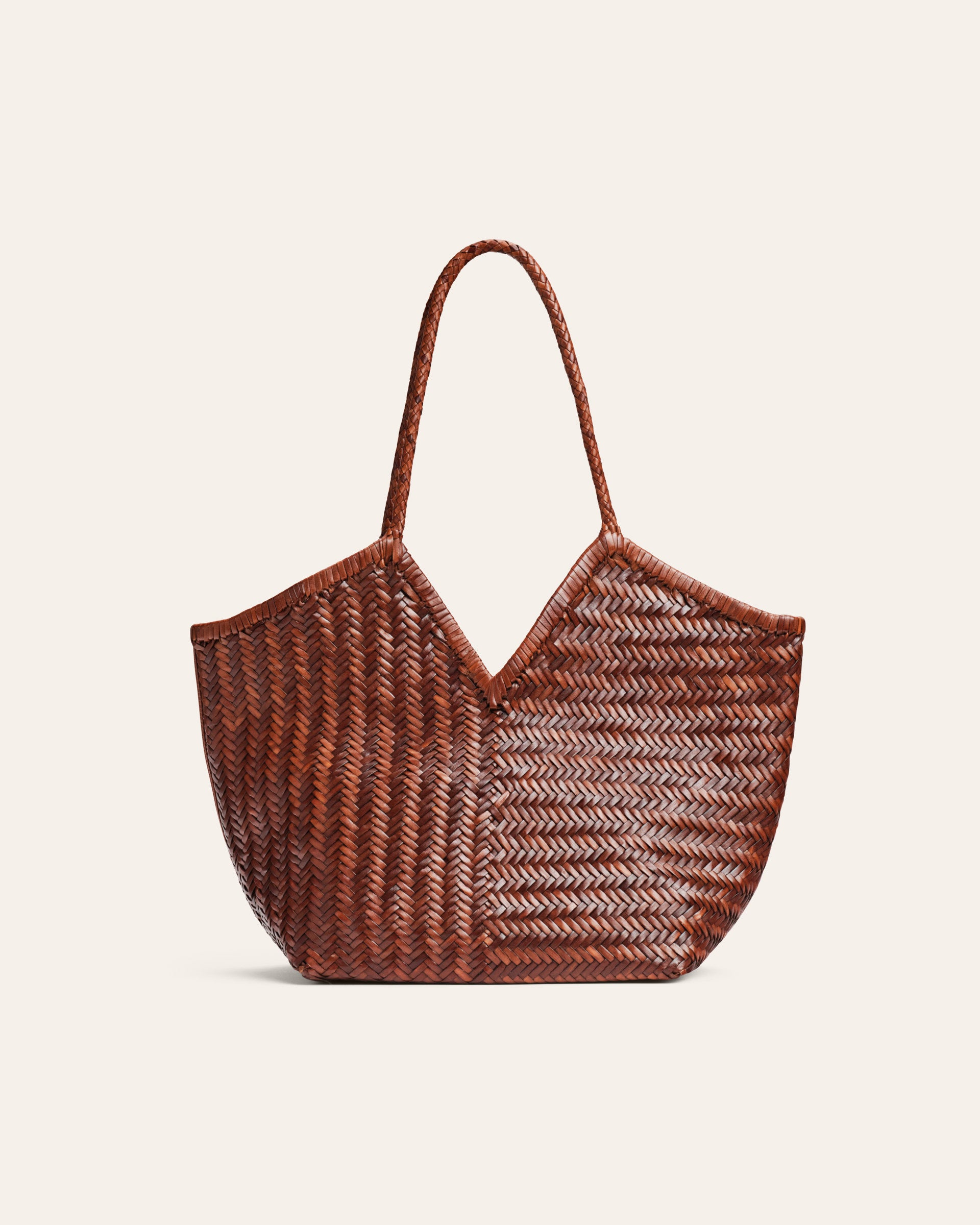 HUMI is a roomy leather tote made to be a practical choice for work, travel, or everyday errands. Handwoven from buffalo leather, it comes in two sizes and various color options. It features a v-shaped cutout on top, and slender handles for a comfortable fit on the shoulder.