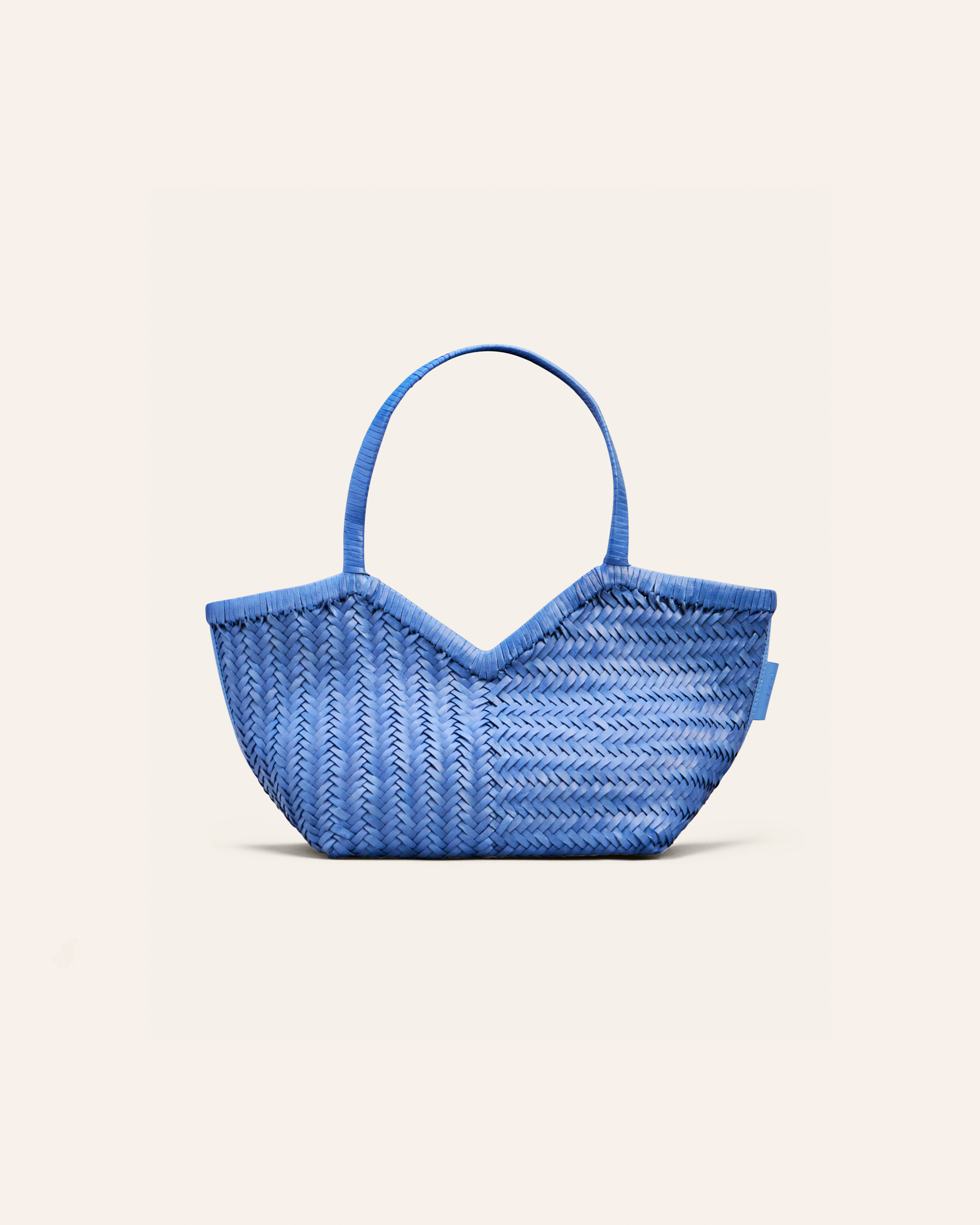 HUMI S is a small leather tote made to carry your essentials and a bit more. Handwoven from buffalo leather, it comes in three sizes and various color options. It features a v-shaped cutout on top, and slender handles for a comfortable fit on the shoulder.