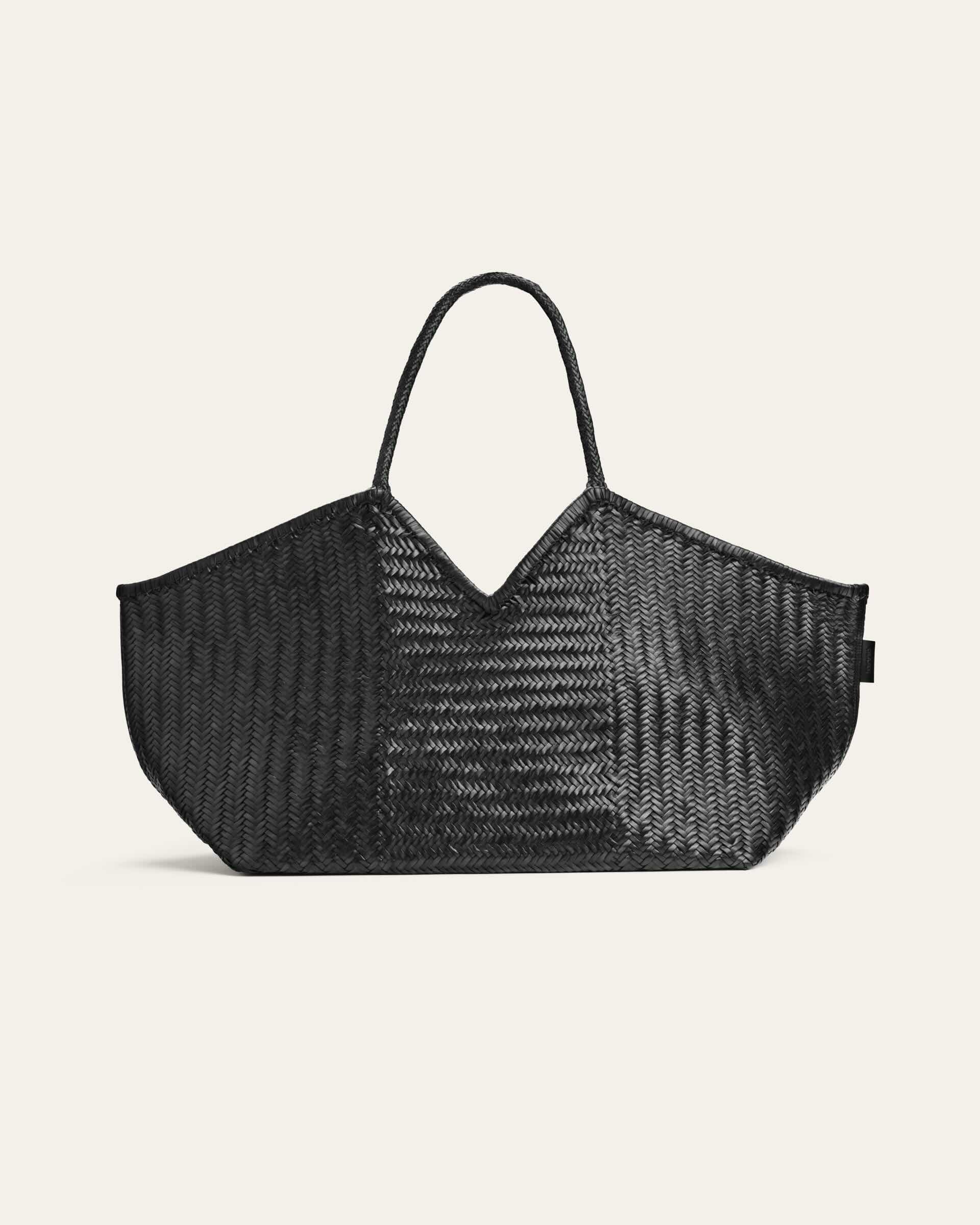 HUMI is a roomy leather tote made to be a practical choice for work, travel, or everyday errands. Handwoven from buffalo leather, it comes in two sizes and various color options. It features a v-shaped cutout on top, and slender handles for a comfortable fit on the shoulder.