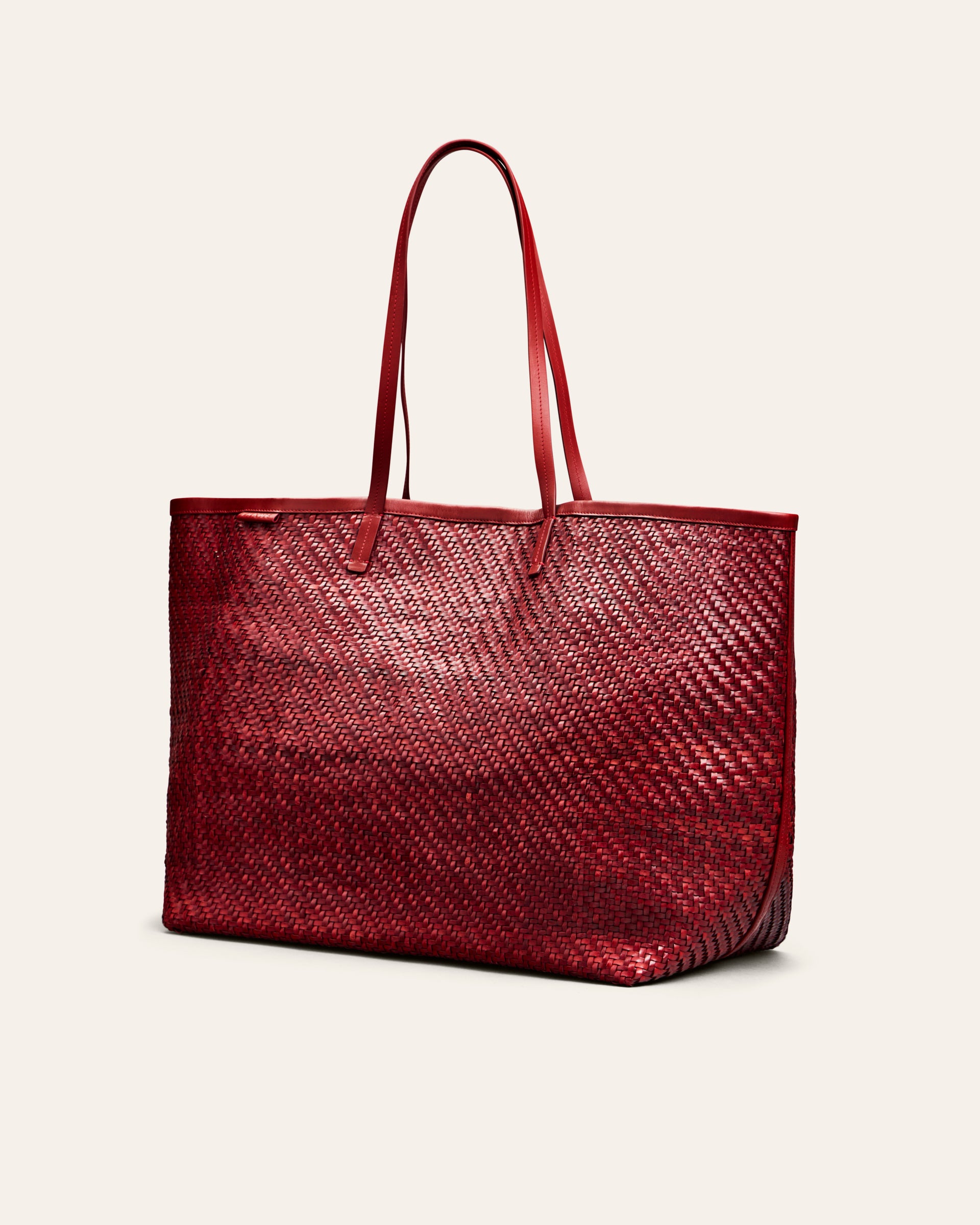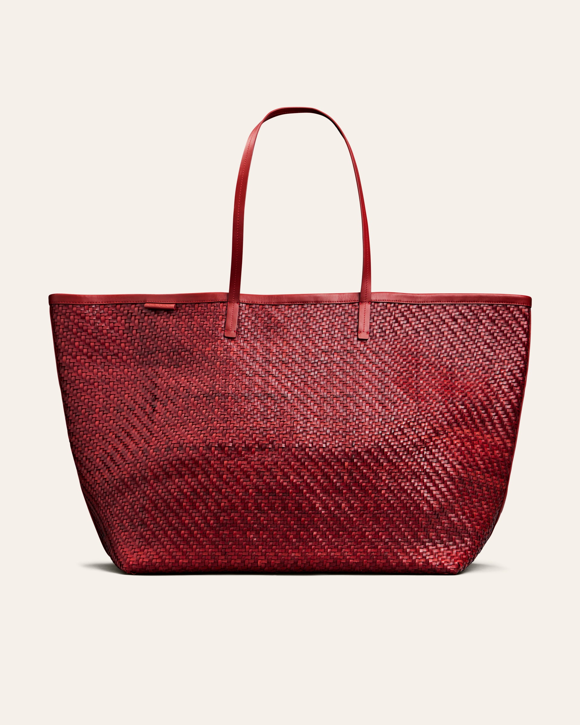 Isai XL is handwoven in high quality leather and crafted in tartan pattern. Each bag is produced by artisans in India, known for its rich and diverse weaving tradition.