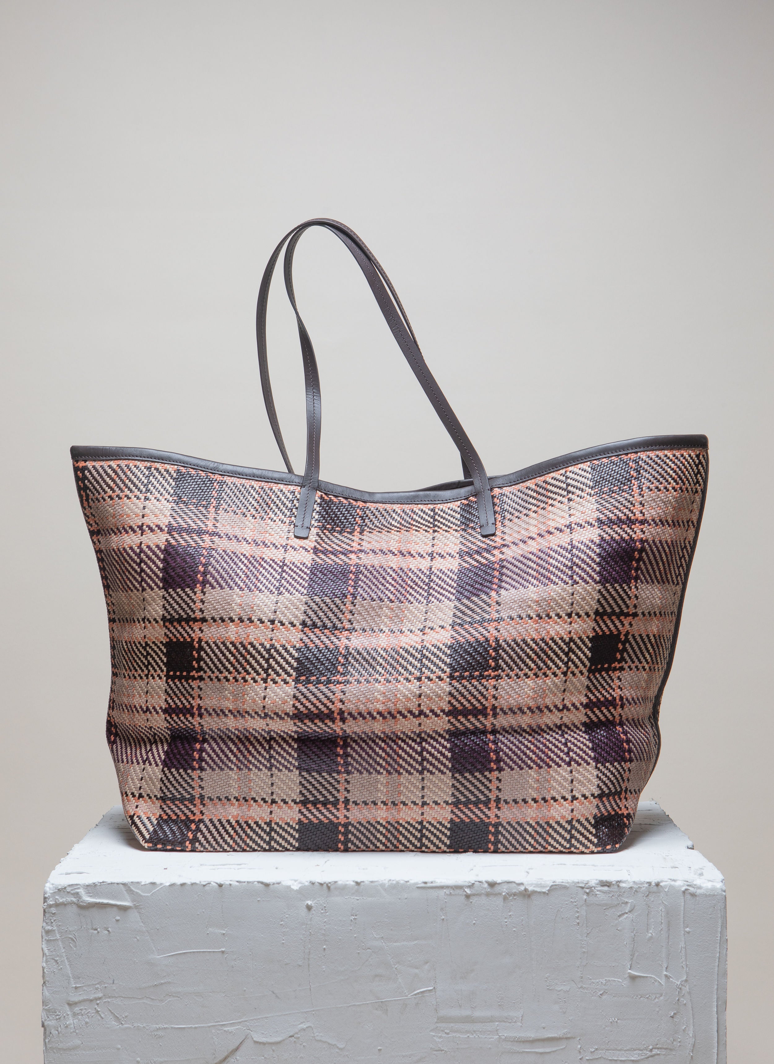 Isai XL is handwoven in high quality leather and crafted in tartan pattern. Each bag is produced by artisans in India, known for its rich and diverse weaving tradition.