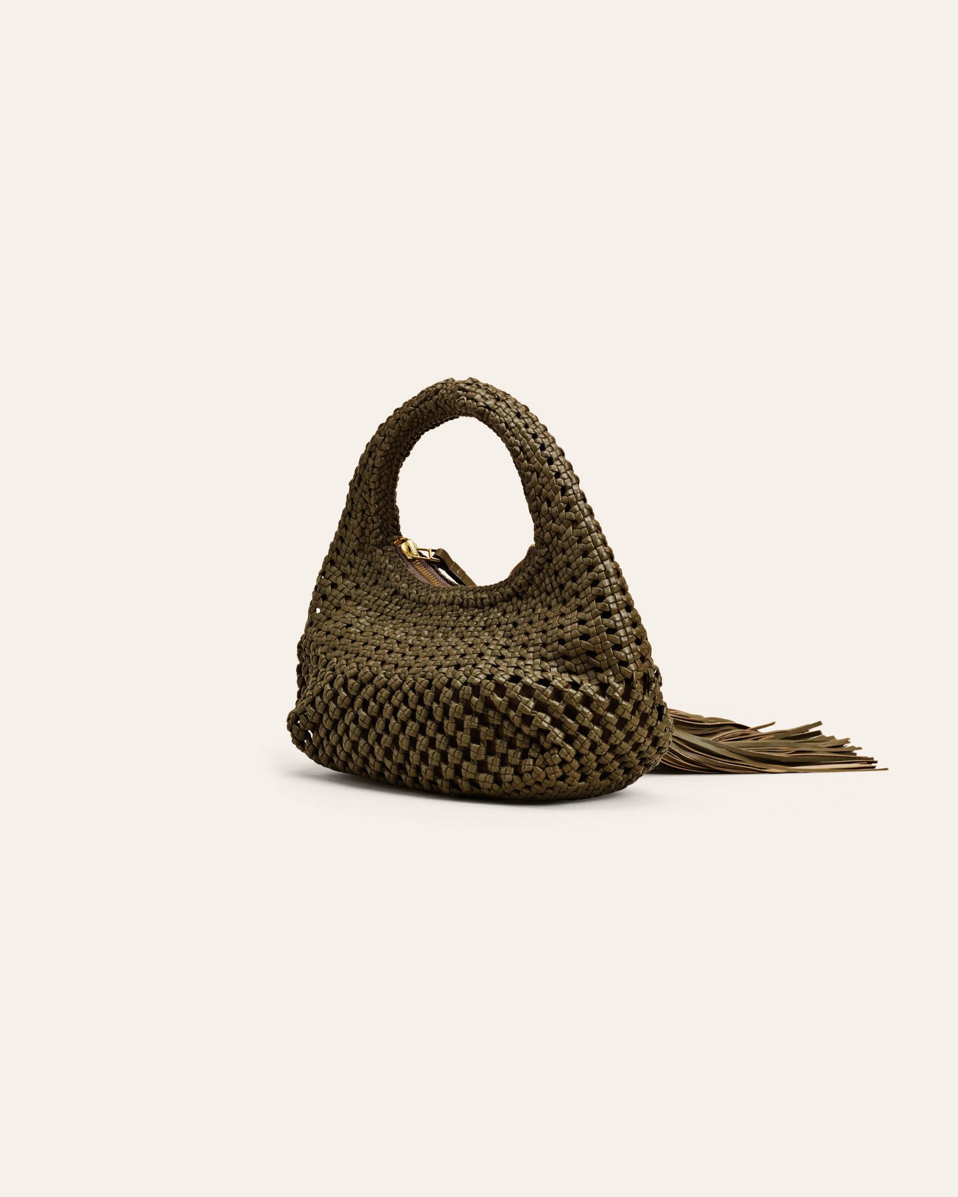 KEDI Mini Bag - hand-braided in a captivating flower weave and topped with long, playful tassels. A cresent and fun silhouette to elevate any stroll around town, wedding or night out. Wear it with jeans, suit, summer dresses or cocktail attire. Yes, this little gem is that versatile. Sized to fit just the bare essentials in the nook of your arm.