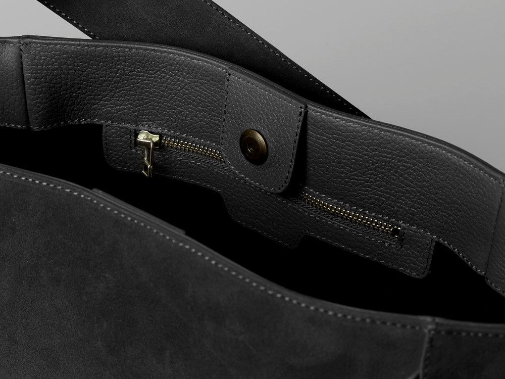 Masago is our leather shopper and tote bag made to assist you in everyday life. We call it simple, yet edgy and timeless. This bag is roomy, will fit your computer, and has a zip pocket inside. The custom-made buckle is inspired by oysters and turns Masago into something special.