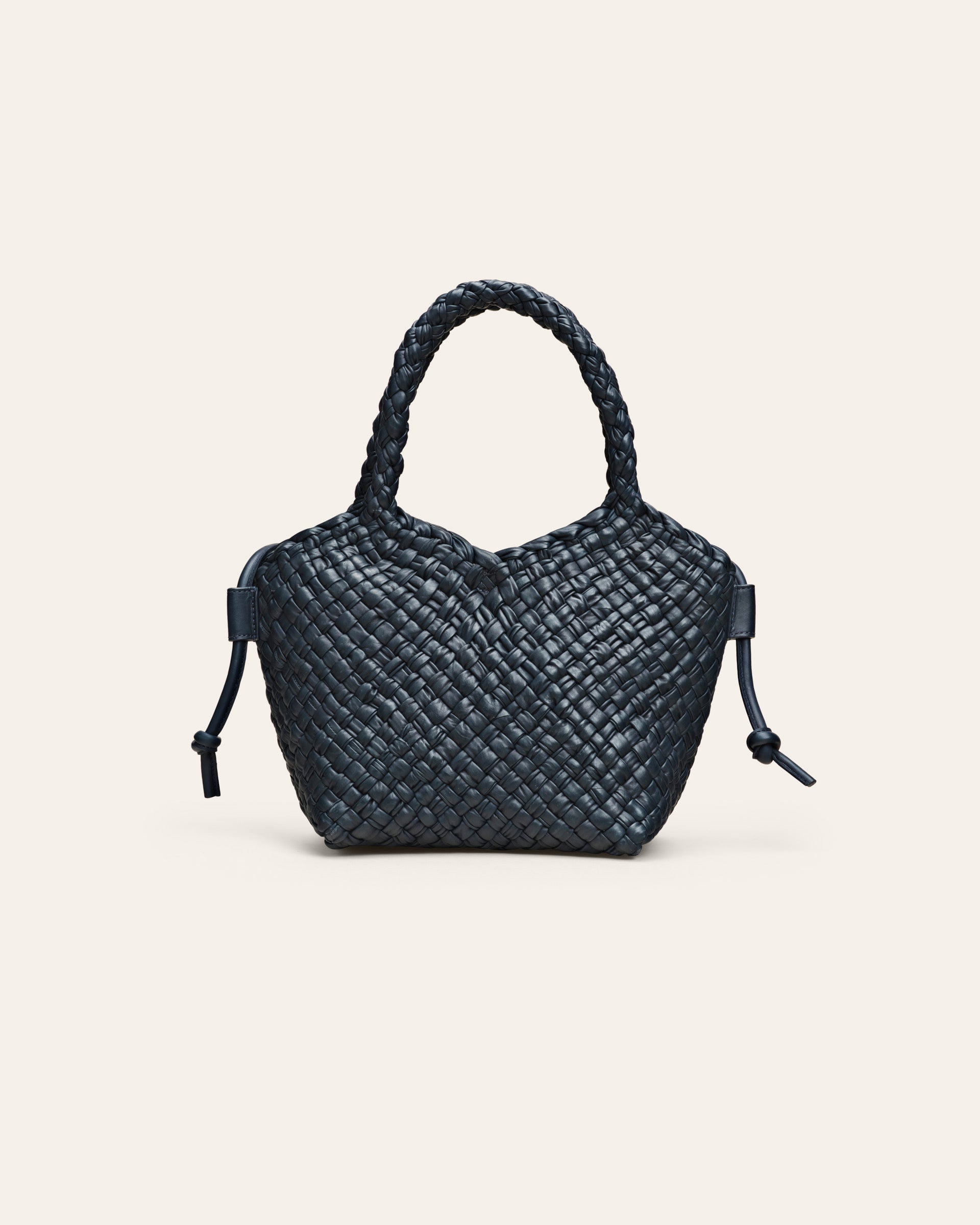 A soft cross-body bag woven in tubular leather strings.