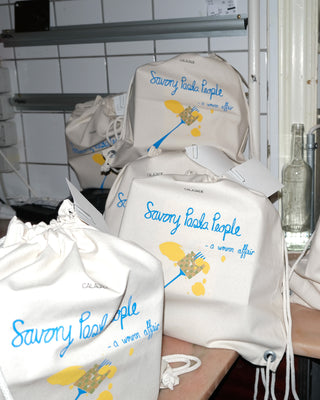 - Savory Pasta People backpack tote in Oeko-tex cotton.